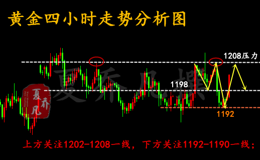 夏乔凡:9.17黄金开盘低位整理,最新操作建议黄金行情分析 大家好,我是乔凡。 人生有两次青春,第一次是生养你的父母给的,第二次则是你靠奋斗得来的。现在的青春用来努力,以后的青春则用来回忆。我会一直奋斗,因为我不想记忆里一片空白。假如能够奋斗,至少,人生里还有一个振聋发聩的主旋律。 经常有人问乔凡,你要打拼多久才算完?我说,至少把事业做出点样子吧。实际上,假如我有朝一日离开了市场,我就不用打拼了吗? 上周的行情用一句话形容:冲高后未能守稳,下跌后录得低位! 上周中黄金市场反弹至1212美元,临近此前1214高点后承压,周五整个白盘虽维持在1200美元关口之上运行,但多头一方乏力不堪,美盘开后