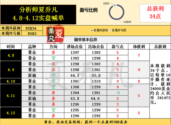 夏乔凡:4.13黄金本周34点利润一网打尽,下周还会跌吗?黄金操作建议 ——尊重市场,跟随市场,计划行事,理性思考,踏准节奏,顺势操作。人生不在于拿到一幅好牌,而是怎样将坏的牌打好。我是乔凡,一个愿陪你东山再起的朋友。 周末愉快!宁可不挣也不要赔对投资者是极其重要的,尤其在对市场没有把握的时刻更要铭记在心。不必奢求次次买底出顶、卖顶平底,戒贪戒慌,获取能够到手的利润,要以平常心看待市场每一次波动,戒贪戒慌,不求成为卖顶买底的高手,只求顺势而为,才能获取成功。 ——4.8-4.12乔凡唯心xqf516一周交易总结: 本周一共操作了12单,获利也不多,这种行情下只能去顺势获利,对于一周拿下34点