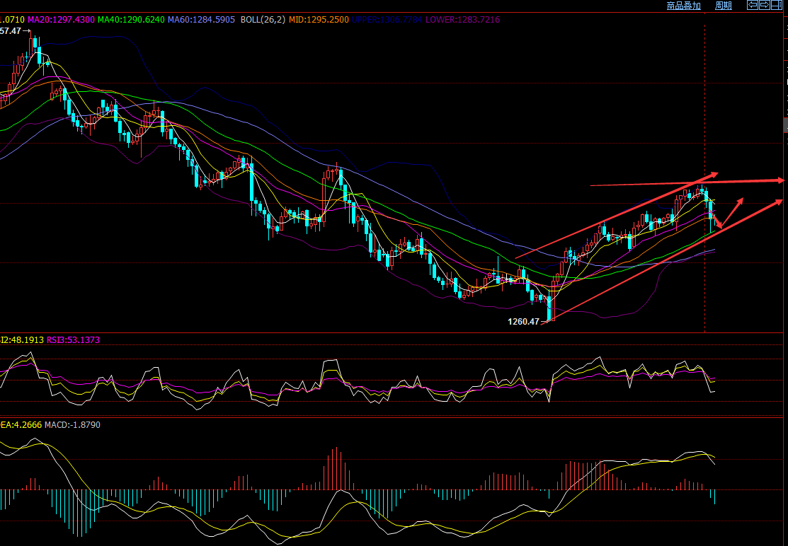 早盘小幅低开1278一线,目前延续前一个交易日尾盘行情继续弱势下行回撤,目前逼近1274一线,上周五在欧盘触及1285快速回撤之后,我们确定1285高点之际全线看空,上周五小幅低位盘整收尾,目前再度延续破底,基本符合上周尾盘点评,收线在1283之下,本周开盘还将继续延续回落! 技术面来看:日线形成背离式下行格局,4H连续收