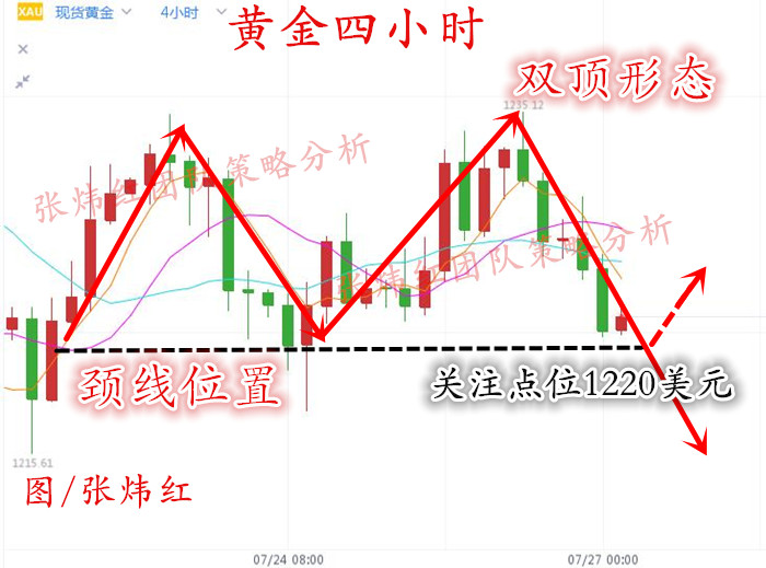 投资无非一个方向,方向是指引,它是看得见,摸得着的,在前进的方向里,总是会有意外的插曲进来,或许失望,或许美好,或许有曲折,顺着方向指引,坚持走下去,而不是固执己见,一错再错。 非农数据较预期有较大差距,公布后黄金的波动相对于上个月来说有所增加,炜红一直坚持的观点,非农影响的是后续的行情走势。 就上个月非农数据而言,公布数据利空黄金走势,而黄金的整体走势表现也是偏空的,当然也有其他因素影响,中间偶有反弹,在技术上也是有形成多头讯号的指引,详见炜红博客之前文章。 就七月份黄金走势而言,金价冲高至1265美元,一路回落至1211美元市场低点,期间两度走出小多头行情,但止步于1236美元一线阻力,