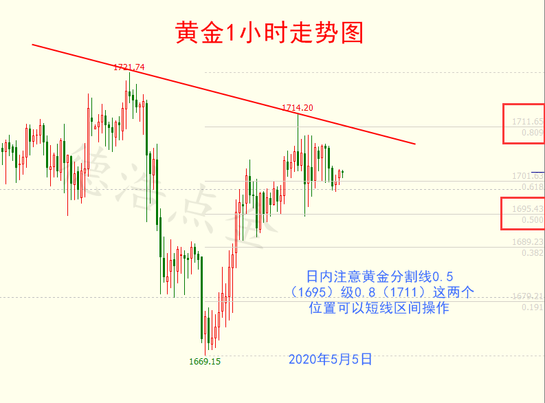 这个市场上没有一夜暴富的机会,不要抱着这种想法来投资,投资唯有稳定才能长久,重仓操作能让你一夜暴富,也能让你一无所有,切勿激进操作;一次盈利或许是运气使然,但是长期稳定的盈利一定是实力,运气不会永远眷顾一个人,或许你还在这个市场兜兜转转找有实力的老师,何不停下脚步,跟上杨振金的操作,你看到的永远是别人的,只有自己真正操作过才能知道老师的实力,也只有跟上操作,你才能变成故事的主角! 5.5黄金行情分析及交易参考 黄金,昨日早间经过小幅度的回撤之后再度上行,延续了上周五总体而言是一个探底回升的局面,而昨日最高触及1714一线,逼近了前期的反抽高点位置和前期的开跌口位置,而昨日的探底回深尾盘高位震