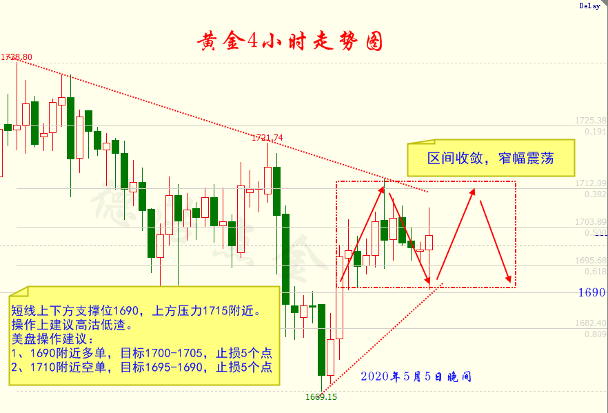 5月6日晚间20:15分公布号称小非农的ADP数据,前值-2.7,预测值-2005,公布值-2023.6。数据公布后小幅利多金银。但是,黄金短线下挫最低1685附近,没过几分钟行情就快速拉升,截止发稿前黄金报价1696。 此外,日前美国方面表示考虑将部分中国商品的关税排除延长一年,市场避险情绪有所降温,但长期来看,黄金仍旧看涨。 德浩结合今晚ADP数据来看,预计周五的大非农大概率也是要利多黄金的,所以,手上现在拿有1700上方多单的朋友先不用担心。但是数据利多,反而短线下挫,那就需要我们注意,这种行情可能会反反复复,短线下跌拉升都正常,应该都是在小区间进行。有所突破(1715-1670)应该