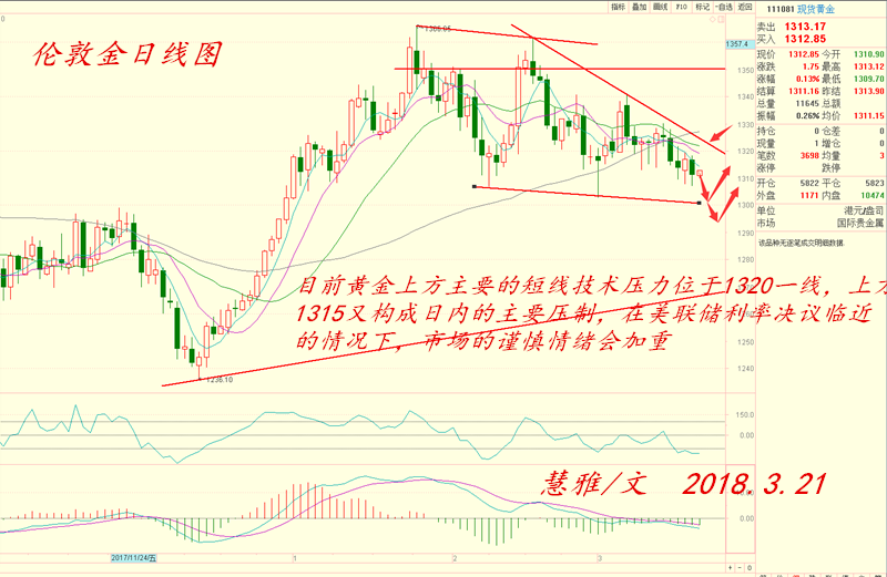 伦敦金行情分析: 昨日黄金承压于1320下方震荡下跌,日线收得一阴线,一度跌破前一日低点,市场情绪的转变主因还是受美联储利率决议临近的影响。 目前黄金上方主要的短线技术压力位于1320一线,上方1315又构成日内的主要压制,在美联储利率决议临近的情况下,市场的谨慎情绪会加重,且某种程度上,市场对于美联储鹰派的预期