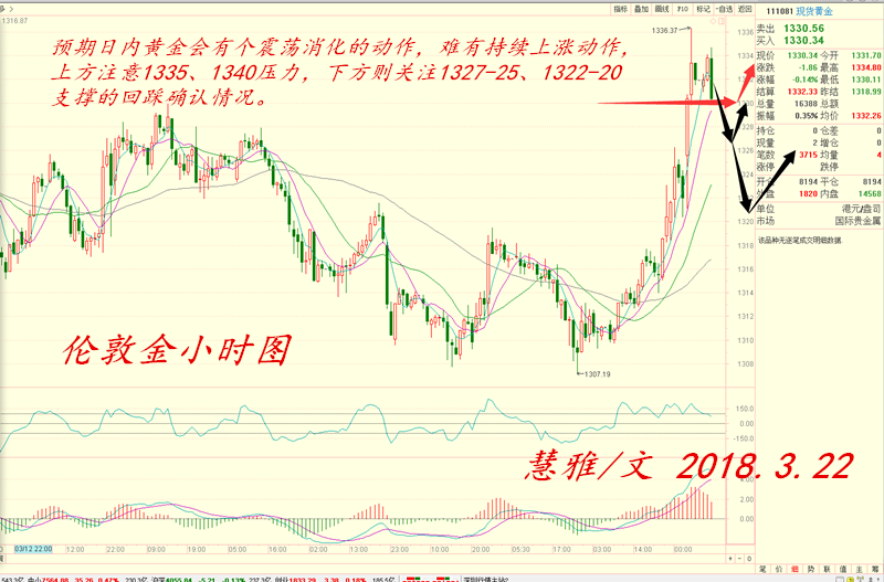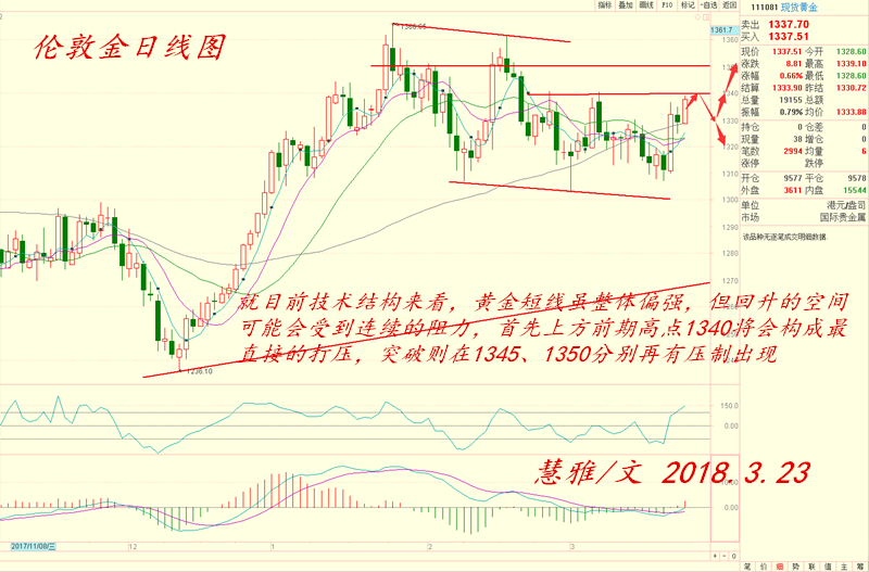 伦敦金行情分析: 昨日黄金震荡回修,符合预期的对前一日获得的大阳进行修正消化,后半夜一度回踩1325支撑,随后震荡回弹至1330附近,最终日线收得一带有上下影线的小阴线。 今日早间黄金延续回升势头,出现再拉升动作,欲测压1340。此波拉升有技术上的需要,即中继修正后再延续回升势头,这也就加强了前一日大阳线的有效性