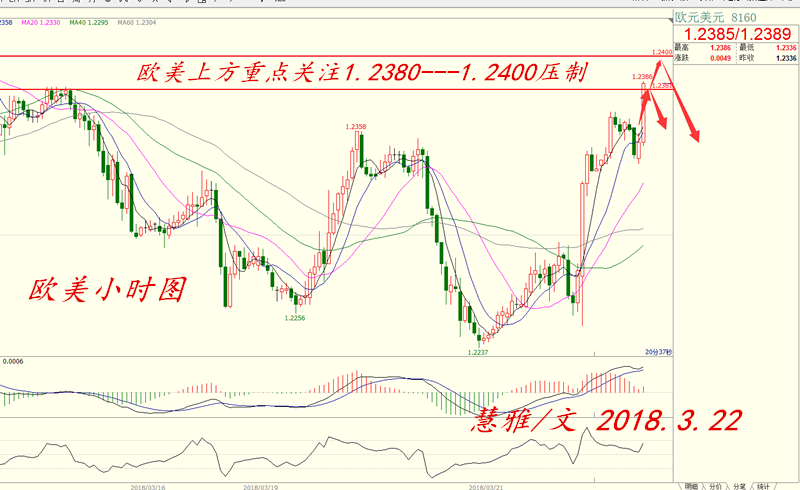 【欧美EURUSD】行情分析: 从小时图上面看 ,欧美回踩60日均线进行反弹,价格震荡上行,日线收长上影实体阴柱。今日开盘价格震荡上行,短期上方承压1.2350压制进行回落。欧盘强势下跌,小时线收实体大阴、现价1.2329一线,技术上面看。5日10日均线开口向下发散成空头排列,附图MACD快慢线即将形成死叉、红色动能柱缩量,CCI开