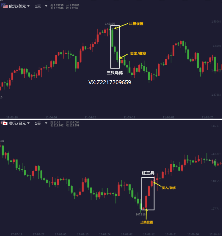 红三兵和三只乌鸦都是典型的三K线组合。红三兵由三根大阳线组成,依次连续上升,最常出现在行情底部或上涨过程当中,是最具攻击力的看涨信号。如果出现在底部,市场很可能迎来强势反转。要特别注意的是,并非随意三根阳线就是红三兵,这一形态必须满足以下具体条件(三根K线按出现的先后顺序命名为K线①、K线②、K线③):
