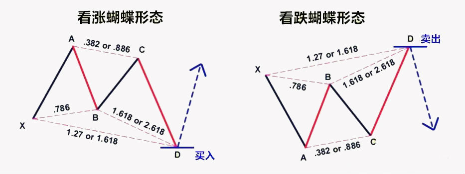 谐波交易的形态基本由X、A、B、C和D五点构成的图形,蝴蝶形态也不例外。蝴蝶形态分为看涨和看跌两种,有四条明显的腿:X-A、A-B、B-C和C-D。这四条腿的关系均基于黄金分割的原理。 交易者在绘制时可用交易或行情平台里的斐波纳契回调线/扩展工具进行 测试。该形态具有以下特征: 1、AB的回调目标应该是XA的78.6%; 2、BC的