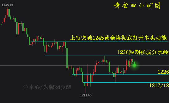 尘本心:7.23黄金今日早间行情分析,如何周入三十万赢在起点? 成功没有捷径,脚踏实地一步一个脚印,该来的总会来,不好高骛远,不急功近利,都要一步一个脚印,踏实的走好每一步,人生也如此做金市也如此。金银市场其实非常简单,只是在长期的操作中, 我们的心越来越复杂而已。现货投资就如运动员训练,一个动作反复训练到条件反射即可, 世间万事万物,大道至简,师法自然。但是炒金还是要摆正一个良好的心态,不能一时的涨停而得意,也不能以一时的跌停而心怀满满的失落感。-----尘本心语录与君共勉 黄金今日行情分析: 今日开盘,金价最高触及到1235,上方重点阻力在1238,反弹这个阻力下可空。 下方支撑线首先关