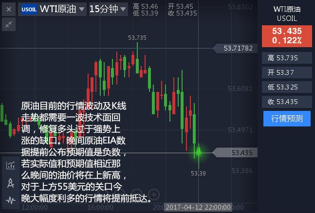 原油53.3震荡上行到53.76附近遇阻目前回调到53.5附近,53.4多单获利0.3美金,从日线看,K线连收4连阳,布林口向上向外开口,K线紧挨布林上轨下方运行,MACD金叉向上,红色量能柱放量,MA5与MA10.MA20,MA60,MA120金叉向上,行情呈上涨趋势.从四小时图看,从2017年3月28至今K线一直运行于布林中轨与上轨的通道内,向上运行,EIA数据利