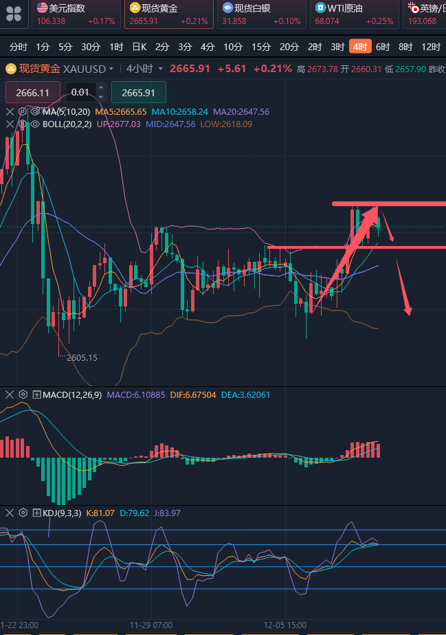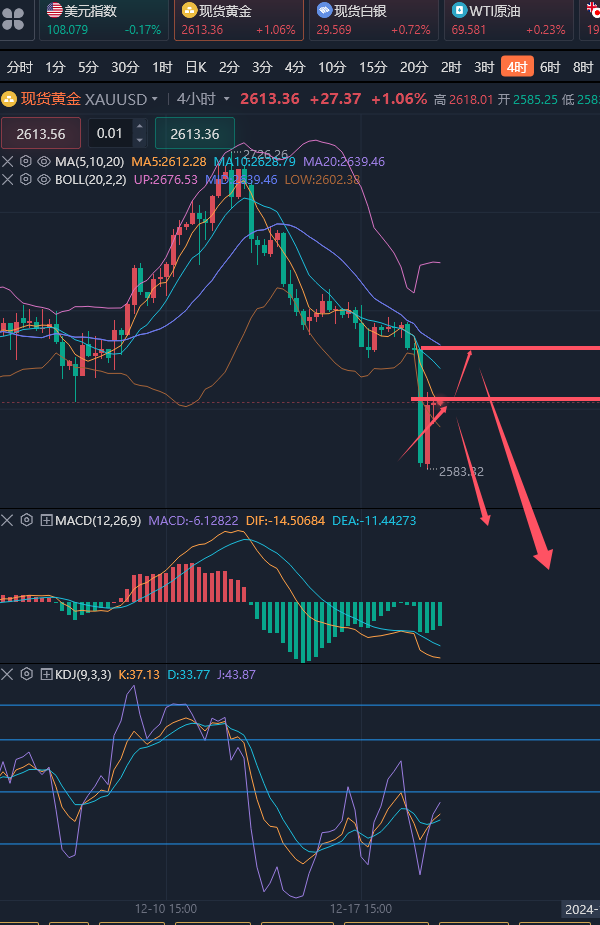 方向对了,不怕路远,坚持就是收获!怕的是,方向明明错了还一条道走到黑!那你再多的坚持也白搭,而且到最后,那种止损后心累的感觉,被抽光最后一丝力气的疲累,是最孤独的!方向错了,越努力越糟糕!在关键时刻,执着固然不可或缺,但转换方向有时也会有别样的收获! ————————消息面 周五(12月20日)现货黄金窄幅震荡,目前交投于2605美元/盎司附近。周四冲高回落,因美国数据强化了市场对美联储未来一年将采取谨慎宽松政策的预期,美元指数和美国十年期国债收益率继续冲高,对金价形成压制。本周现货黄金累计下跌约1.6%。黄金价格近期在2600美元附近盘整,市场情绪相对谨慎。投资者普遍关注美国即将发布的个人