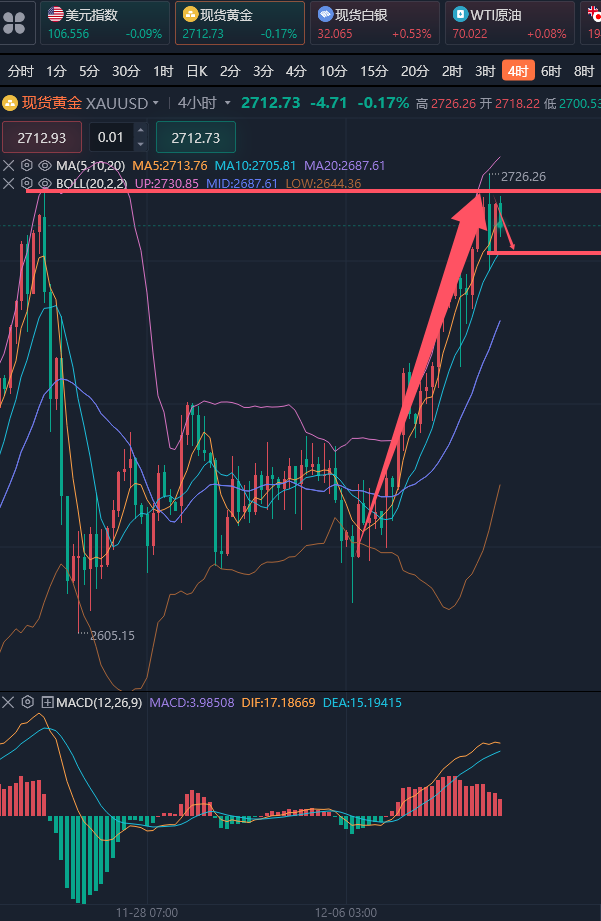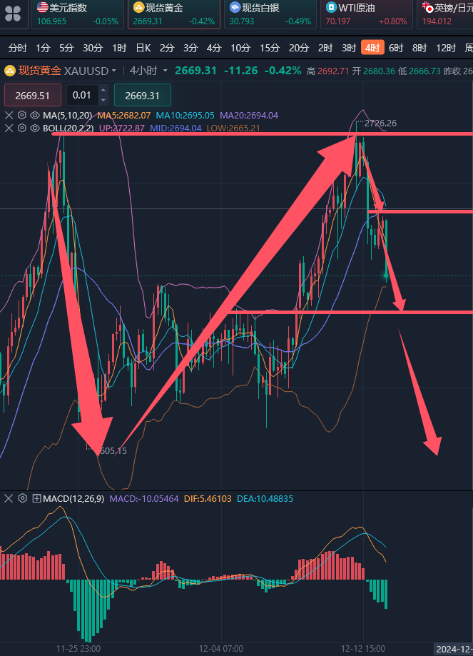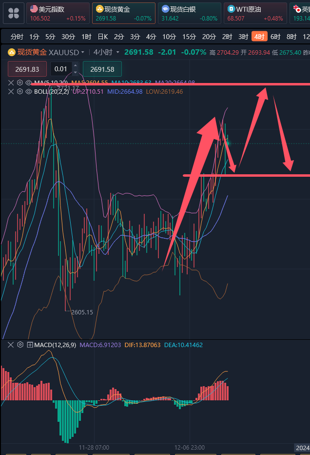 在操作过程中总会有一些外界因素我们必须克服,要耐得住寂寞,经得起诱惑,看得清陷阱,抓得住机会。最终的胜利必将属于我们! 不求单单盈利,只求稳健盈利、稳健给单,制定好做单方案,掌握好趋势抓住每波大行情,获得一个长期稳健的盈利! ————————消息面 周四(12月12日)亚市,现货黄金冲高回落,受美联储降息预期升温和地缘局势支撑,金价盘初延续隔夜涨势,一度刷新逾一个月高点至2726.05美元/盎司,但随后快速回落,一度触及2700关口,主要可能是部分多头获利了结。近期,黄金市场受多重因素推动,表现出明显的双向价格波动。地缘政治紧张局势加剧,包括俄乌局势恶化和中东冲突持续,令避险需求居高不下。同
