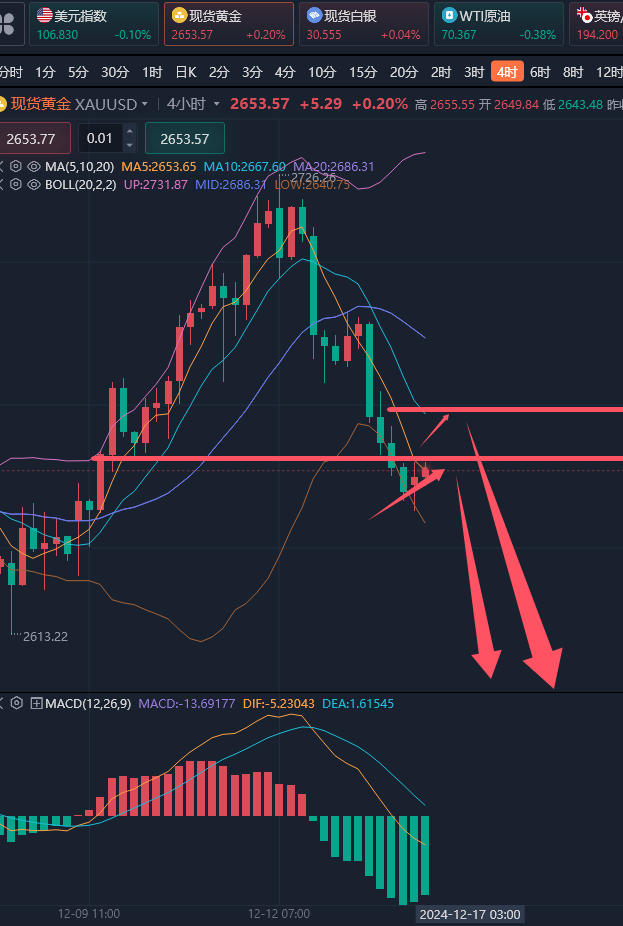 大行情抓不住,小区间拿不准,一直在扫损!相信很多者朋友都遇到过的问题,那么问题的症结出在哪里?原因很简单,因为你做单没有章法、不懂理性,总是在追涨杀跌,凭感觉做单,小赚即出,大亏却一个不漏!当你拿着大把的本金进入这个市场,你本来有大赚一笔的资本,但却将一把好牌打的稀巴烂。做单,首先看趋势,其次看点位!有理由的操作,无论对错及时检讨,这才是投资! ————————消息面 周一(12月16日)现货黄金窄幅震荡,目前交投于2652.87美元/盎司附近。虽然市场普遍预计美联储本周将会降息,但因为美国经济数据仍相对强劲,市场预计美联储本周在降息的桶可能会释放鹰派信号,这帮助美债收益率上周升至近三周高位