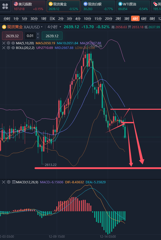 做交易要做到,开仓有把握,建仓有着落,持仓有风控,平仓有利润。宁可明明白白放弃,不可稀里糊涂错过!复杂的行情简单做,简单的行情重复做,为什么我们总是在纠结行情本身,而忘了我们的目的不过是找准机会赚一笔钱,踏入市场那一刻请大家记住,无论行情如何变化,重要的是我们能做的有哪些,笔者的文章每天坚持更新中,没有百万盈利刺激你眼球,只不过是让你按着我的分析节奏赚上五六个点,公道自在人心,能不能赚钱不是我说了算,就让行情去证明谁才是市场的常青树。 ————————消息面 周一(12月23日)现货黄金窄幅震荡,目前交投于2629美元/盎司附近。金价上周五大涨近30美元,受美元和美债收益率走软支撑,此前美国