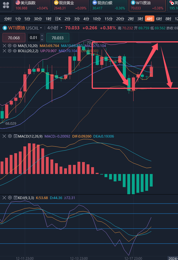 做单我们要有“落袋为安”的心态,而不是一味盲目追求最大利润。我们能做的是要把握住自己能赚的那部分利润。我们在这个市场是来赚钱,而不是来扛单的。赚钱了,该出的就出;到止损点,该割的就要割。这样才能把风险降到最低。不怕做错单,就怕一根筋到底和裹足不前。大胆操作,谨慎控制,获利自然水到渠成。 ————————消息面 周三(12月11日)现货黄金延续涨势,一度刷新逾两周高点至2704美元/盎司。金价周二大涨1.27%,初步顶破了过去两周的震荡区间,受地缘政治紧张局势升温和美联储下周第三次降息预期支撑,同时市场目光转向周三的美国通胀数据,而这部分因素偏向压制金价,需要予以警惕。 原油延续昨日上涨,交投