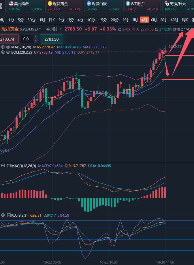 任何一种交易策略都只是修行的工具,工具并不能****让你稳定盈利,让你稳定盈利的应该是一个好的心态。分析永远是辅助,策略才是赢利的基本。对于技术,没有对错,关键性的分水岭,易成为行情转折的拐点抑或助推趋势的延伸。但交易中或结价操作中,咱们必须果断,在对的方向里坚持,而当方向错误时,调整战略就是进步,转身就是盈利。道路虽有坎坷,但跟随市场的指引总能令我们柳暗花明。 ————————消息面 周三(10月30日)现货黄金震荡走高,目前交投于2784美元/盎司附近。由于围绕美国总统大选和中东冲突的不确定性,以及对美联储降息的预期,提振了黄金的吸引力,周二金价创下历史新高2775.26美元/盎司,收报