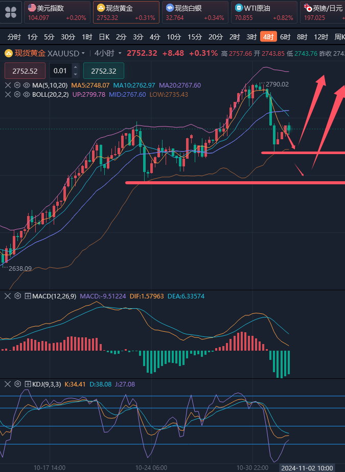 在交易当中只要保住本金、保持良好的心态和精神,那么赚钱只是时间上的问题。在这个市场中一定要牢记三个第一:安全第一、保本第一、生存第一。还有一点也是需要注意的那就是在别人恐惧的时候贪婪,在别人贪婪的时候恐惧,永远不要随大流,一定要有自己的见解! ————————消息面 周五(11月1日)现货黄金窄幅震荡,目前交投于2749美元/盎司附近。金价周四从历史高位回落,一方面是因为美国初请失业金人数等数据表现靓丽,打压了美联储降息预期,另一方面,以色列和黎巴嫩真主党的停火谈判中取得了“良好进展”,打压了避险情绪,还有一部分多头在非农数据和美国大选前获利了结。今日将迎来美国10月非农就业报告,市场预计当