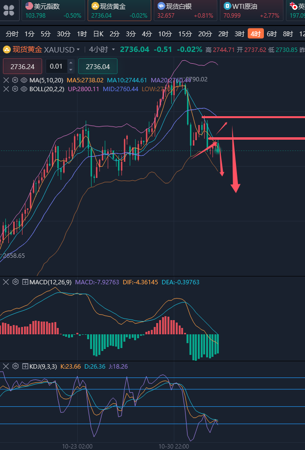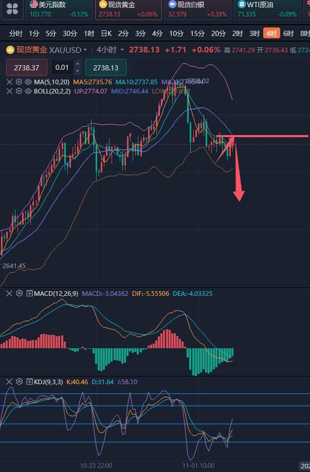 交易中想要盈利,要遵守的就是顺势而为。很多投资者在交易上总是觉得自己天赋异禀,总是想要展现出自己的“聪明才智”,当市场行情大涨的时候,他总是觉的要到达压力位,当市场低迷的时候,他却总是觉得行情马上要上涨,这样的对市场没有根据的“自信”往往就会使投资陷入一种没有依据的瞎猜之中,最后的结果想必也不会太好。因此在交易中,一定要顺应市场的形势进行操作,在一些特殊的反转点可以有自己的想法,但是也一定要在市场的趋势下进行操作,才会有好的结局。 ————————消息面 周一(11月4日)现货黄金窄幅震荡,守在2730关口上方,目前交投于2737美元/盎司附近。金价上周五下跌0.3%,收报2735美元附近,