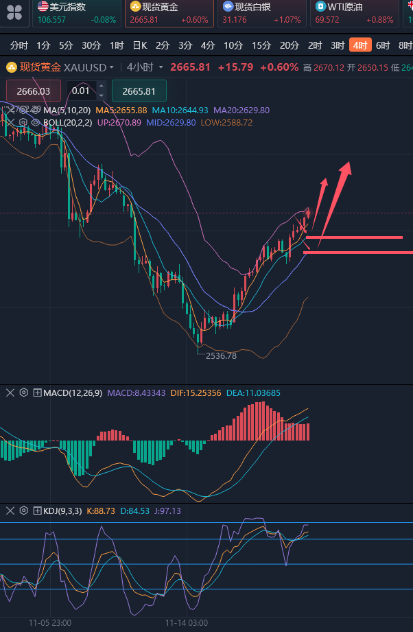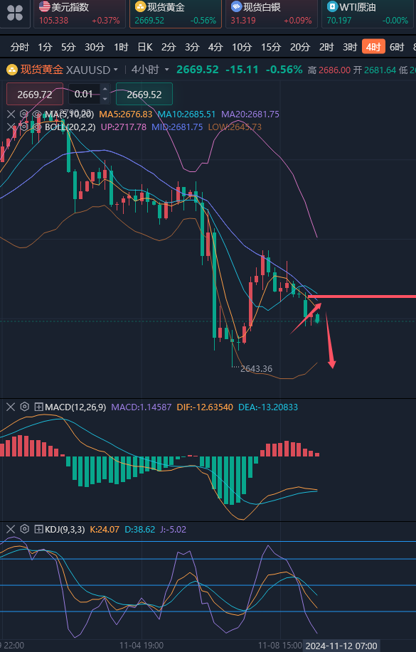 投资犹如下棋,棋艺高者能看出五步,七步甚至十几步,而棋艺低者只能看出两三步,高者顾大局,谋大势,不以一子一地为重,以最终赢棋为目标,低者则寸土必争,只为争一时之需,结果频频受困。所以看趋势,一定要有长远眼光,目光所致,便是你所能拿到的利润,你只能看到的只有眼前5个点,那你便只能拿到5个点的利润,你能看到100个点,那么你能拿到的就是100个点的利润。 ————————消息面 周一(11月11日)现货黄金窄幅震荡,目前交投于2670美元/盎司附近。金价上周五下跌0.8%,收报2684.37美元/盎司,周线下跌1.85%,创下五个多月来最大单周跌幅,受美元走强打压,市场消化特朗普胜选的影响及其可