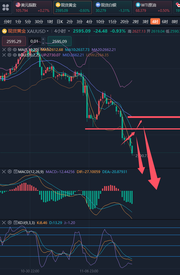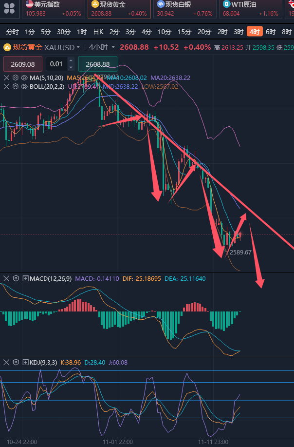 在这个市场摸爬滚打,讲究的是一个学习参与的过程和后期长期稳健获利的结果。一旦产生亏损,要及时总结原因出现在哪里,要让亏损的资金产生他的价值,每做一笔交易,有理有据的进场,且严格遵守这个市场的规则,在一个正确的引导之下,实现长期稳健获利的目标是很容易实现的。心态比策略重要,策略比技术重要,技术比运气重要,同样选择很重要。 ————————消息面 周二(11月12日)金价延续跌势,现货黄金一度刷新近一个月低点至2590美元/盎司,投资者继续涌入被认为将因特朗普****上台而受益的交易,美元延续涨势,小幅刷新近七个月高点至105.71,令金价继续承压。 原油小幅震荡,目前重回箱体支撑下沿,基本面上