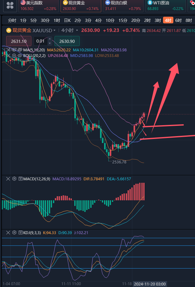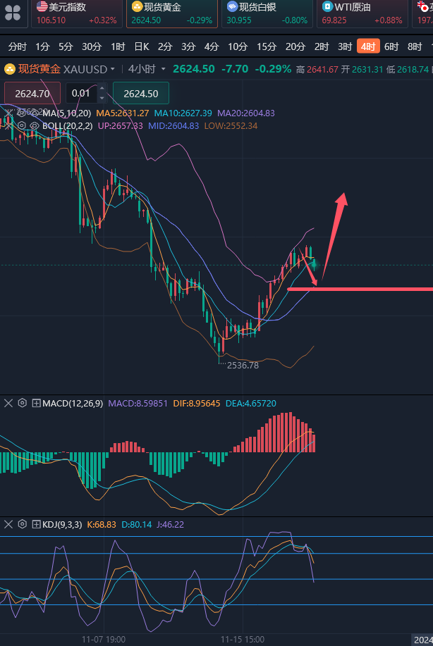 交易中想要盈利,要遵守的就是顺势而为。很多投资者在交易中总是觉得自己天赋异禀,总是想要展现出自己的“聪明才智”,当市场行情大涨的时候,他总是觉的要到达压力位,当市场低迷的时候,他却总是觉得行情马上要上涨,这样的对市场没有根据的“自信”往往就会使投资陷入一种没有依据的瞎猜之中,最后的结果想必也不会太好。因此在交易中,一定要顺应市场的形势进行操作,在一些特殊的反转点可以有自己的想法,但是也一定要在市场的趋势下进行操作,才会有好的结局。 ————————消息面 金价周三(11月20日)震荡走高,现货黄金一度刷新逾一周高点至2641.65美元/盎司,目前交投于2625美元/盎司附近,因俄罗斯和乌克兰