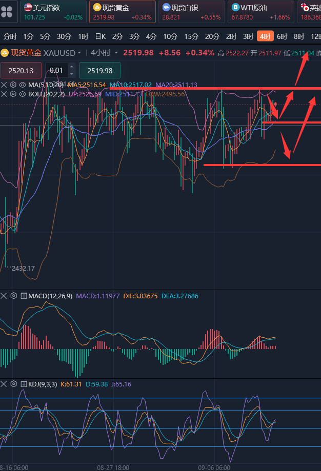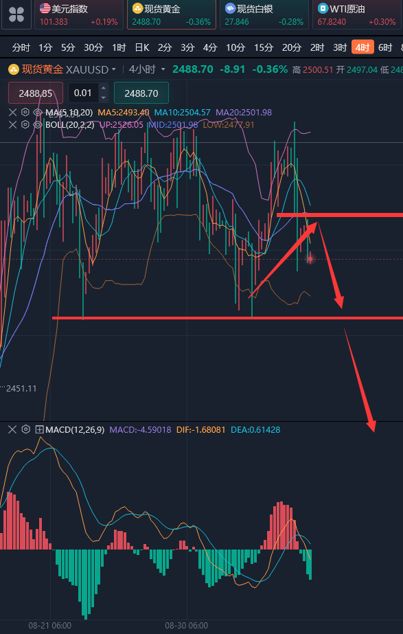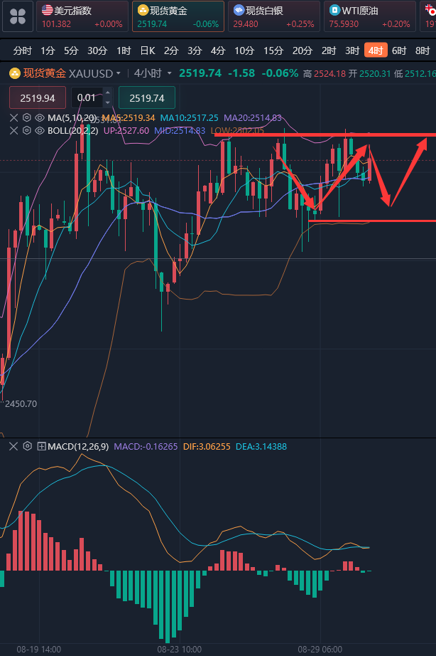 做单我们要有“落袋为安”的心态,而不是一味盲目追求最大利润。我们能做的是要把握住自己能赚的那部分利润。我们在这个市场是来赚钱的。赚钱了,该出的就出;到止损点,该割的就要割。这样才能把风险降到最低。不怕做错单,就怕一根筋到底和裹足不前。大胆操作,谨慎控制,获利自然水到渠成。 ————————消息面 周五(8月30日)现货黄金震荡微跌,目前交投于2520美元/盎司附近。金价周四上涨约1%,收报2521.02美元/盎司,因地缘局势担忧情绪升温,金价一度升至2528美元附近,逼近历史高点,但美国二季度GDP上修,初请失业金人数暗示劳动力市场稳健,美国经济仍具有韧性,打压美联储9月份降息50个基点的预