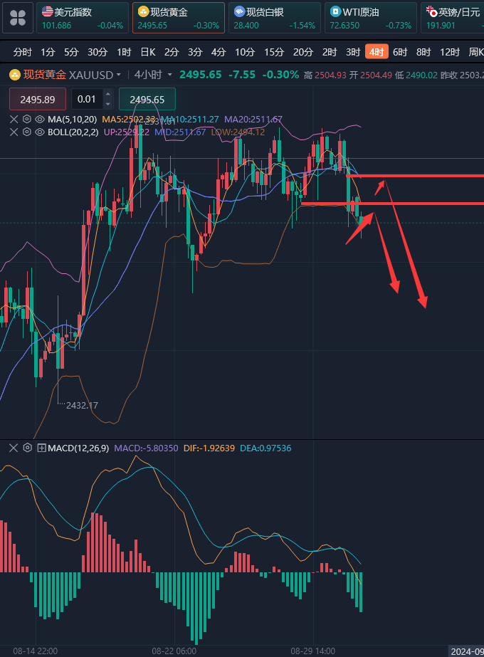 投资就是一场修行,修行的目标是为了明心见性;明心见性后,并不意味着我们获得了某种超能力,而是更加的了解了自己、了解了交易的真谛,找到合适自己的方法,坦然接受交易中的不完美,不与市场对抗,将交易中的大亏避免掉,自然就能稳定盈利了。 ————————消息面 周一(9月2日)亚盘现货黄金短线突然急跌逾10美元,最低跌至2490美元/盎司,刷新了一周低点。上周五金价下滑1%,在美国通胀数据符合预期后美元和美债收益率走强,金价盘中一度跌至2494.12美元/盎司,但由于美联储9月降息的可能性仍然存在,黄金仍录得月线涨幅。 原油延续跌势,刷新逾一周低点至72.4美元/桶。投资者评估OPEC+供应将从10