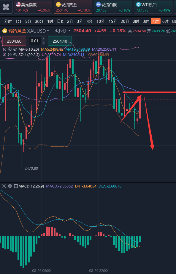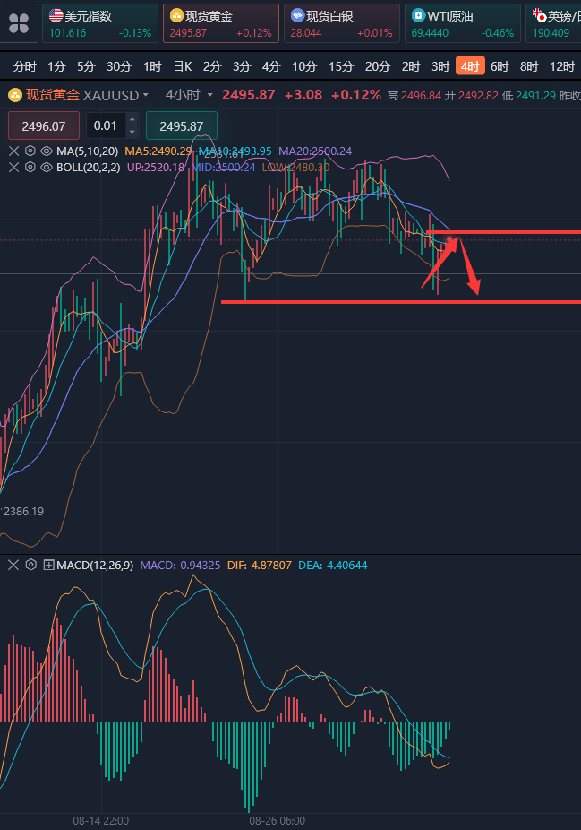 投资市场并不会简单的朝着预期的方向进行,通往成功的路都是曲折的,而一旦走反,则将会失去方向,进入了循环,行情也同样如此,趋势是一定的,但是绝对不会简单地朝着预定方向一直走,期间会出来曲折而动摇人的内心,这时候就需要好的心态来面对,不受短线的走势所影响,这就是前期我们一直坚定布局波段,都是成功获利的原因,守得初心,方得始终,投资市场需要定力,需要持之以恒的决心,然后再去收获利润! ————————消息面 周三(9月4日)现货黄金窄幅震荡,目前交投于2494.08美元/盎司附近。金价周二盘中一度创逾一周新低至2473.36美元/盎司,受美元坚挺打压,不过,美国ISM制造业PMI数据表现欠佳,拖累