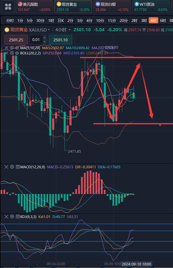 历史总是在不断重演,而技术分析本身就是一个寻找规律的过程,只要行情一旦形成规律,后面延续也将是大概率,所以只要规律找的好,不怕交易做不好,当你明白这个道理,你会发现原来交易真的是大道至简,而并没有想象中的那么复杂! ————————消息面 周二(9月10日)现货黄金窄幅震荡,目前交投于2502美元/盎司附近。金价周一小幅反弹,回升至2500关口上方,收报2506.04美元/盎司,美债收益率反弹受阻,徘徊在15个低位附近,给金价提供反弹机会,但美元指数的反弹,令金价涨幅受限。投资者等待美国通胀报告为美联储可能的降息规模提供进一步线索。 原油周一上涨约1%,因市场担心预计周三袭击路易斯安那州的飓