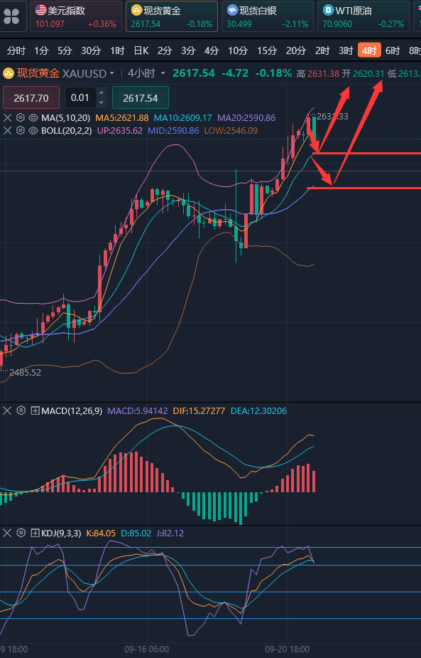 做投资最重要的两点:一是要懂得风险控制;二是要懂得分析行情,为什么风险控制放在第一位呢?很多朋友多会说投资风险大,其实笔者想说的是:投资本身没有风险,失控的投资才有风险。不要用你的侥幸去挑战行情,运气这东西是有,碰上一次别再去奢望第二次。学会止损,止损比止盈更重要,因为任何时候保本都是第一位的,盈利才是第二位的。 ————————消息面 周一(9月23日)现货黄金在历史高位附近窄幅震荡,目前交投于2616美元/盎司附近。全球地缘政治紧张局势为金价提供了强有力的支撑。尤其是中东局势再度升温,成为黄金避险需求上升的主要推手,与此同时,美联储货币政策走向也是影响黄金走势的重要因素。近期美联储官员表