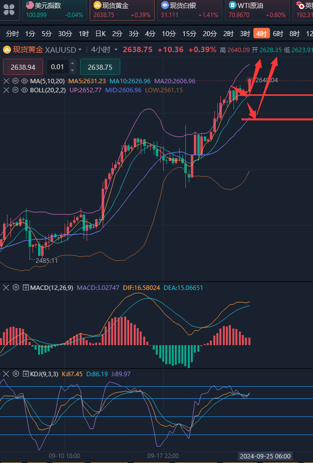 近期市场波动比较大,相信很多朋友都出现了不同程度的亏损,亏损的情况不同,应对的方法也有所不同,但有一点是相同的,那就是任何时候不要因亏损而破坏你的心态。我们可以赔钱,但不能赔心,一旦心理防线被打乱,那什么情况你也没有对策了,结果就是深陷泥潭,越挣扎亏损也多。 ————————消息面 周二(9月24日)现货黄金延续上涨,目前交投于2639美元/盎司附近。黄金周一盘中创历史新高至2634.74美元/盎司,收报2628.33美元/盎司,涨幅约0.24%,美联储上周降息后的市场看涨情绪加上地缘政治紧张局势推动金价上涨,不过美元指数企稳反弹,乌克兰总统泽连斯基称俄乌战争“接近结束”,投资者需要提防金价