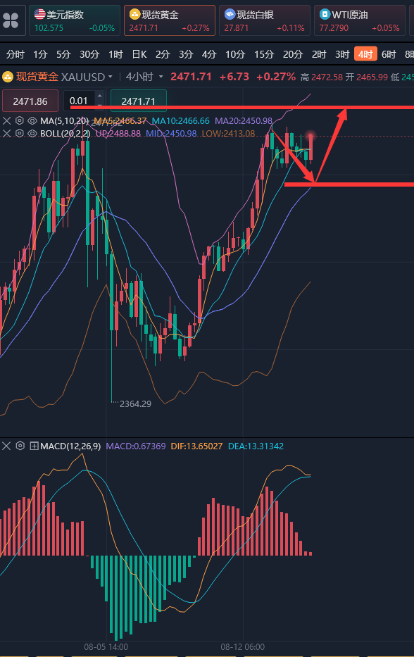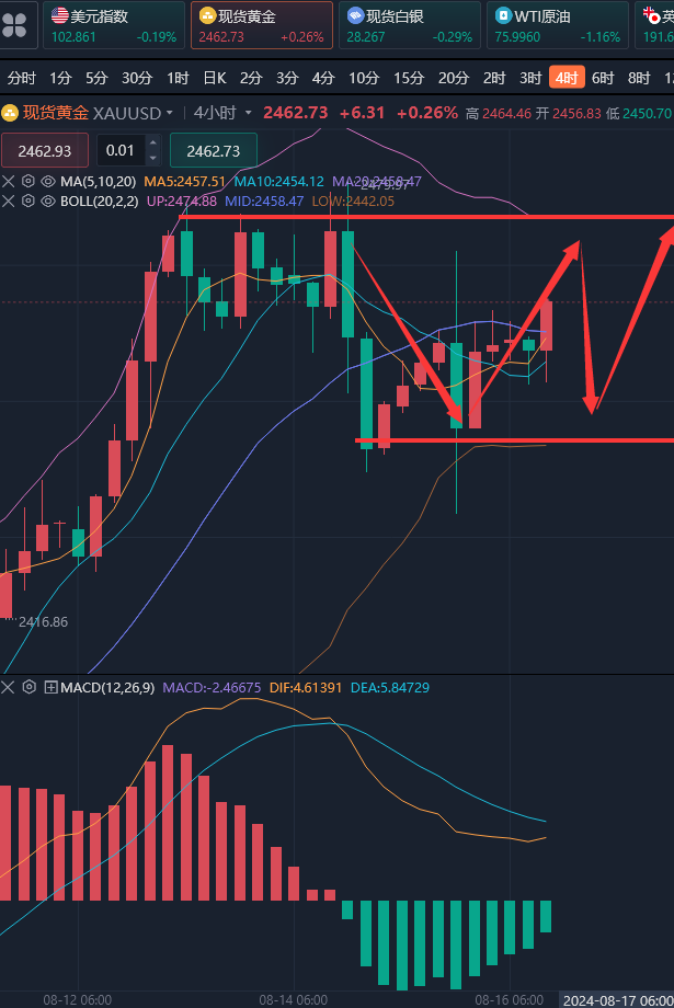 金融市场对每一个人都是公平的,既然有人赚钱,肯定也有人亏钱,投资最重要的不是你一次一周能够赚多少钱,关健在于你能不能长期稳健获利,短线做波动,中线做波段,长线做趋势,方法策略没有好坏之分,只要适合自己能达到稳定赢利都是好方法,但是想在投资中获利,真的没有捷径,只有像苦行僧一样,每日认真作功课,勤于积累。只有每日稳稳地拿住短线收益,我们才能在投资这条道路上走的更远。切勿急功近利,逆势而为,与行情争多空。 ————————消息面 周五(8月16日)现货黄金窄幅震荡,目前交投于2462美元/盎司。金价周四震荡运行,盘中最高涨至2470关口附近,但因为初请数据和“恐怖数据”表现强劲,美债收益率上涨,