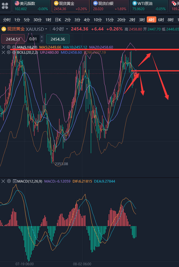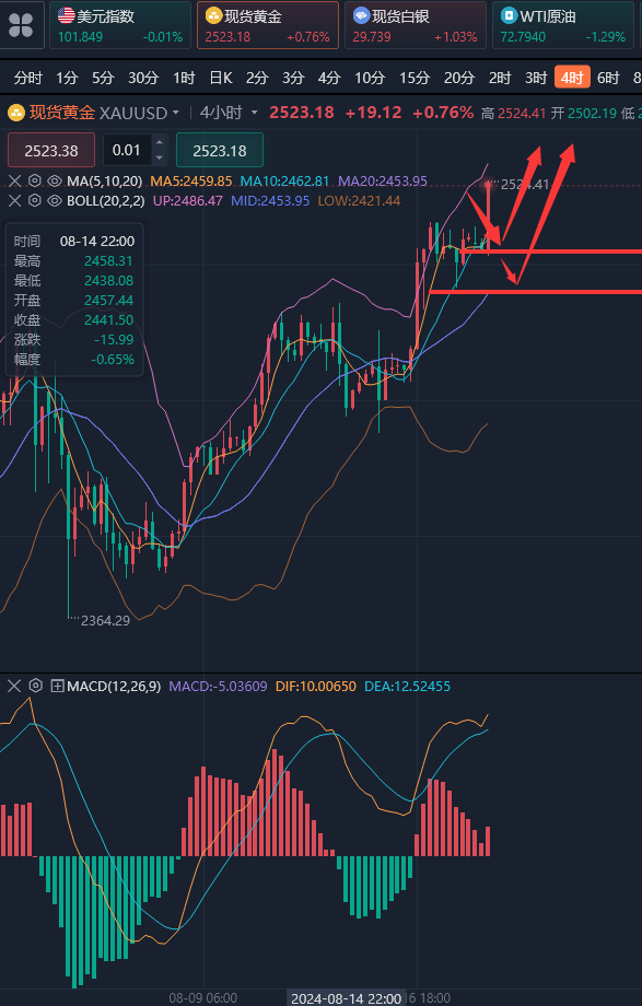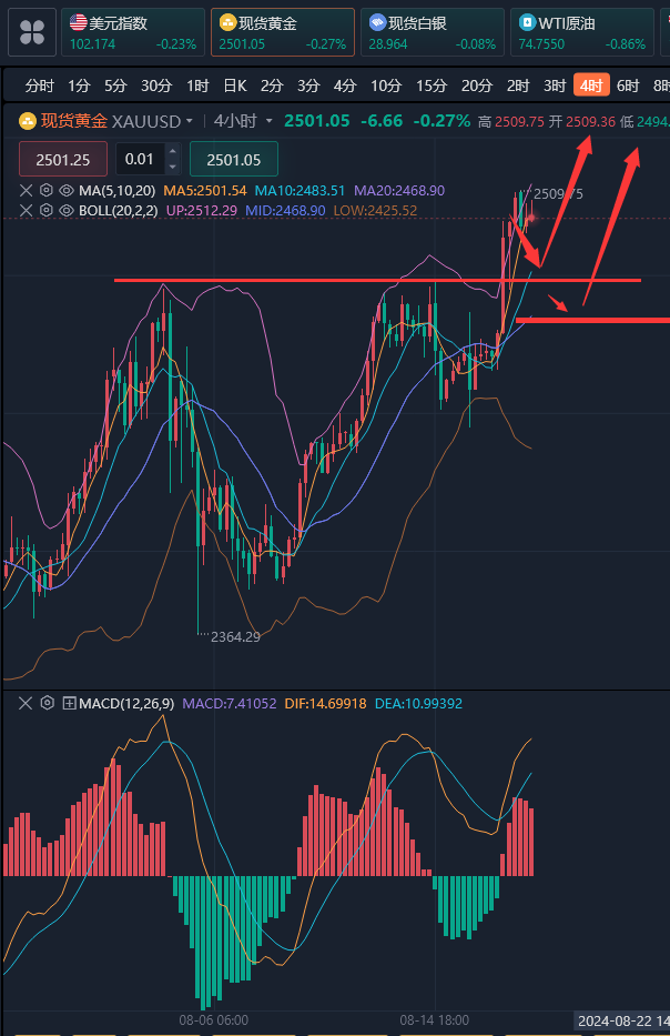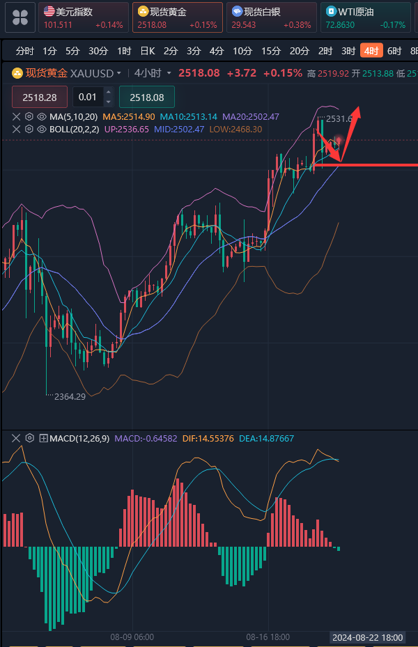 行情无时无刻不处于变化之中,我们的操作思路也会随着行情变化而变,一个合格的交易员就应该具备像狼一样的嗅觉,能把握住转瞬即逝的机会,能在危险面前发出预警。 ————————消息面 周三(8月21日)现货黄金高位窄幅震荡,目前交投于2518美元/桶附近。金价周二延续创纪录涨势,一度刷新历史高点至2531.58美元/盎司,收报2513.88美元/盎司,坚守在2500美元的关键水平之上,受助于美元走软创年内新低以及投资者对美联储可能在9月降息的信心增强。美元指数跌至七个月最低,使得黄金对持有其他货币的投资者更具吸引力,美国10年期国债收益率下跌至逾两周低位,也降低持有黄金的机会成本。 原油低位徘徊,
