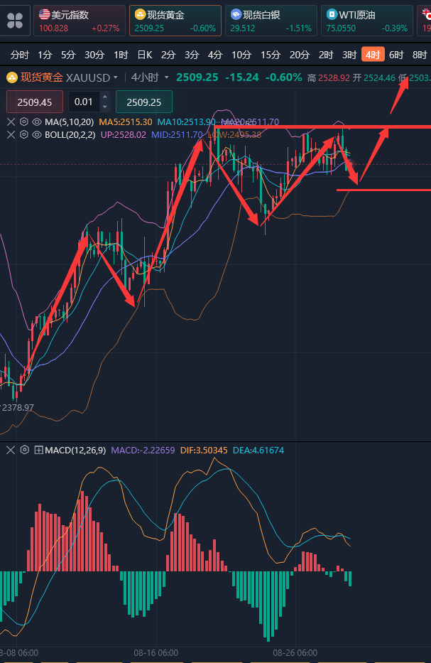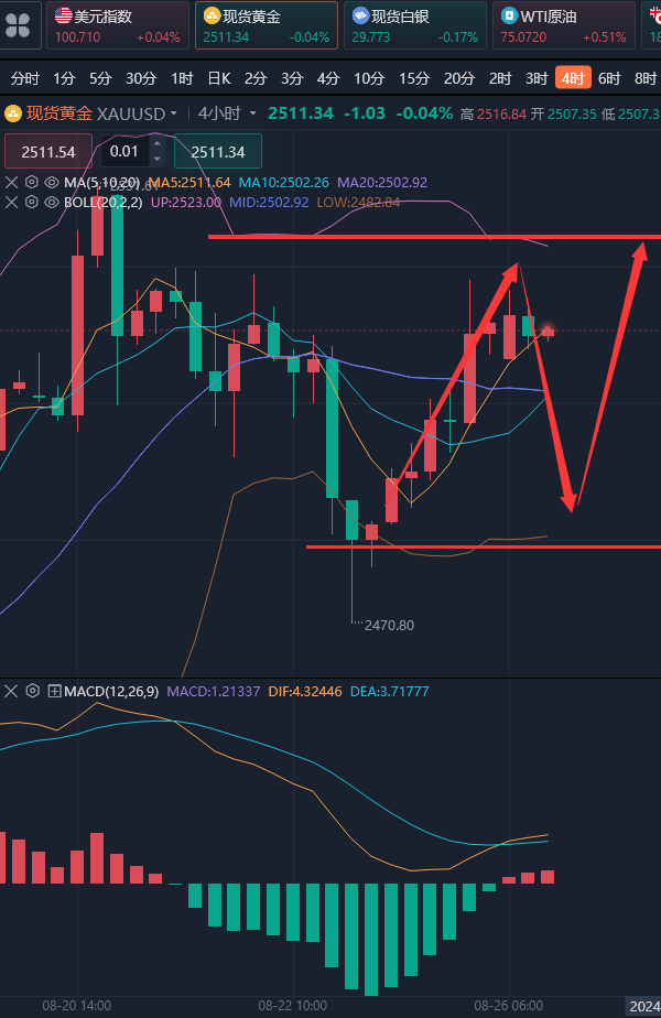没有做不到的事,只有不想做的人。如果你对你目前的亏损现状无动于衷那么只能证明你在逃避,你不甘心于亏损,若真的不甘心请你学会改变,若你不愿改变,则说明你伤的还不够深,如果你相信我,可以找到我,我会尽力去帮助你,一位愿与你同舟共济的分析师. ————————消息面 周一(8月26日)现货黄金窄幅震荡,目前交投于2510美元/盎司附近,守在历史最高收盘价附近。金价上周五上涨超过1%,收报2511.85美元/盎司,因在美联储主席鲍威尔发表了9月份降息的言论后,美元和国债收益率回落。刚刚过去的周末,真主党向以色列北部发射数百枚导弹,以色列称对黎巴嫩的先发制人打击阻止了更大规模的袭击,真主党称袭击已完成