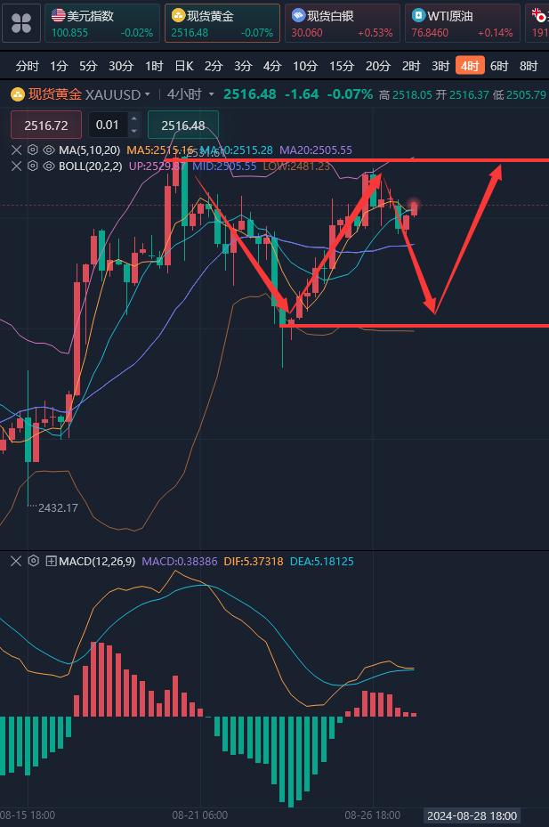 如果你不握紧拳头,你就不知道你力量到底有多大;如果你不咬紧牙关,你就不知道你的坚持到底有多狠;如果你不跺脚而起,你就不知道你的果决到底有多正确;如果你不瞪眼,你就不知道你的内心到底多强大。最强悍的竞争力只有两个字:行动。只有当你足够努力,你才会足够幸运。这世界不会辜负每一份努力和坚持。 ————————消息面 黄金高位震荡,目前交投于2515美元/盎司附近。金价周一走强,接近近期的纪录高位,金价盘中一度涨至2526.74美元/盎司附近,因美联储主席鲍威尔发出鸽派信号后,市场加大对9月降息的押注,另外,中东地缘政治风险引发避险需求。 原油窄幅震荡在逾一周高位附近,现报76.8美元/桶。油价周一