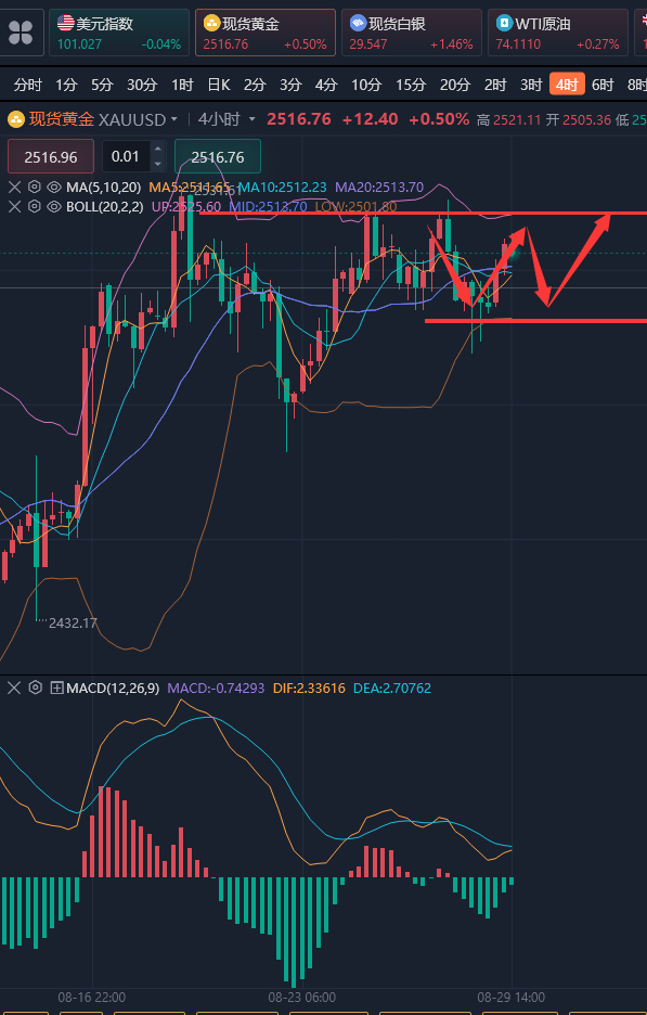 短线做波动,中线做波段,长线做趋势。投资的两端分别是分析和交易,而连接这两端的是等待,等待的核心是谨守能力圈和尊重常识,耐心等待最好的机会出手,避免频繁交易是公认的致胜法宝之一。 ————————消息面 周四(8月29日)现货黄金小幅上涨,目前交投于2517美元/盎司附近。金价周三下跌0.8%,收报2504.46美元/盎司,受美元走强的影响,投资者关注全球最大经济体的关键通胀数据,以寻找美联储9月份可能降息规模的线索。 原油震荡微涨,目前交投于74美元/桶。油价周三收低1%,此前美国原油库存降幅小于预期以及对亚洲大国需求的担忧持续存在,但中东和利比亚的供应风险限制了油价的跌幅。 本交易日将出