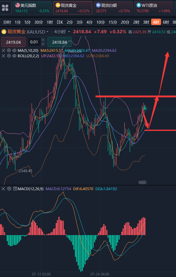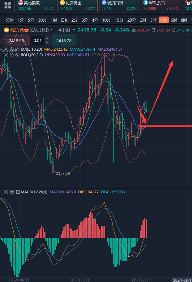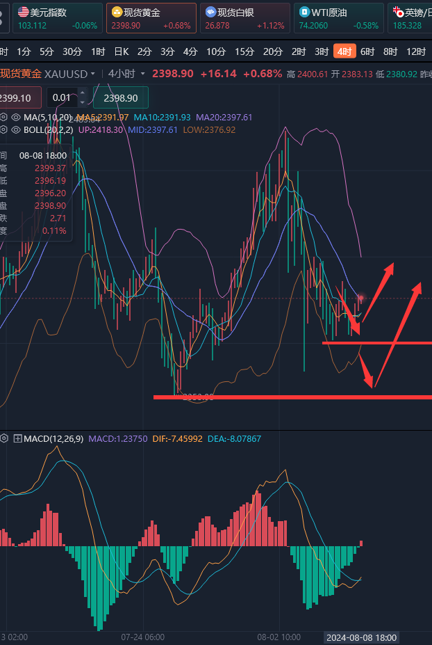 交易本无高手,只是失败的多了,总结的多了,就成长了、成熟了而已,每一个高手都是从学徒开始的,华丽的跌倒,总是胜过无谓的徘徊,不要因恐惧而丧失自信,不要因懦弱而耽误前程。优柔寡断是弱者的天性,而强者眼里没有失败,坎坷都是通往成功路上的一个小景点,你若前进,世界都会为你让路。 ————————消息面 周四(8月8日)黄金窄幅震荡,目前交投于2394美元/盎司附近。随着美元和国债收益率上涨,金价周三反弹受阻,收报2382.85美元/盎司,跌幅约0.29%,不过美国9月降息的押注增加和中东地缘政治紧张局势加剧给黄金带来支撑。 原油震荡目前交投于74.5美元/桶附近。油价周三上涨超过3%,从数月低位反