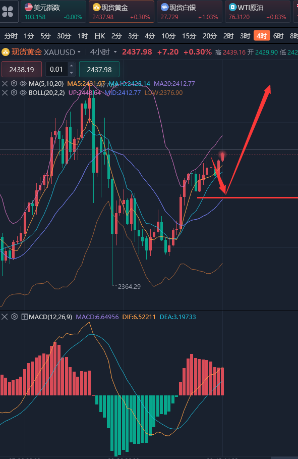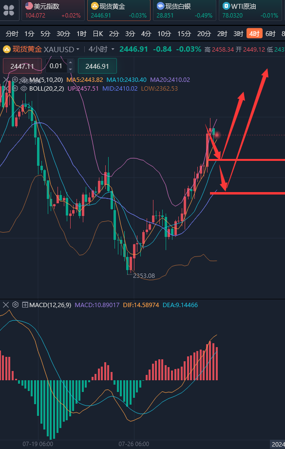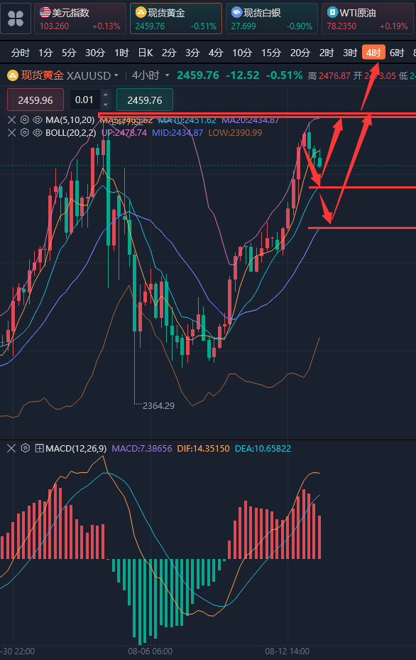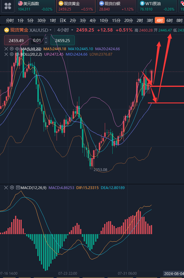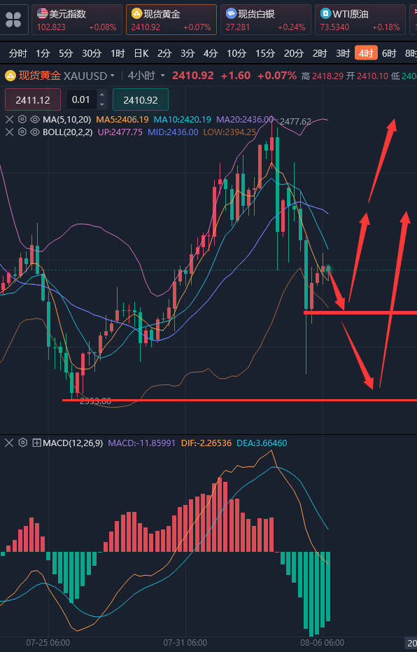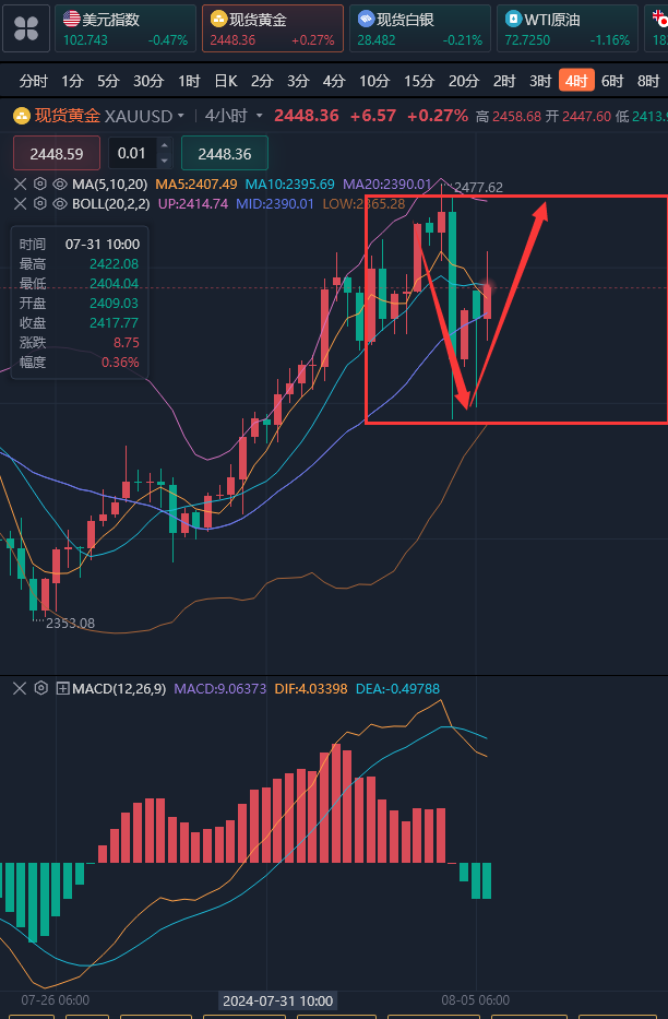 做投资前你必须要明白一件事:做投资,资金是你的,保障是你的,万一赔钱也是你的,最后赚钱也是你的!投资永远是留给有规划、有责任心的人,我的时间也只留给信任我的有缘人!最好的实力体验就是长期的观察一个老师每天的思路,而不是简单的一个现价单子就将你躁动的内心平静。投资者与分析师始终是双向选择的关系,相互尊重,彼此信赖才有可能实现真正的合作,有了合作才可能实现共赢! ————————消息面 周一(8月5日)现货黄金窄幅震荡,目前交投于2450美元/盎司附近。上周五金价冲高回落,早些时候因为美国非农数据差于预期,一度涨至2477.58美元/盎司附近,但随后多头趁机获利了结,金价回吐涨幅,并由涨转跌,盘