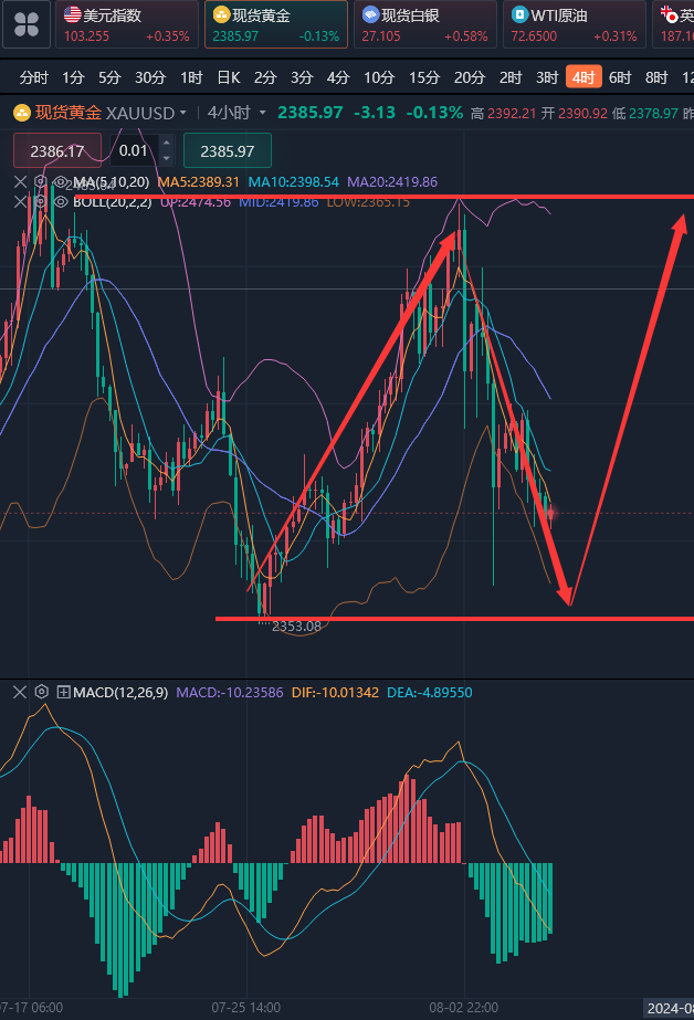 投资是长久的事情,以饱含学习的思维去看待投资,你的投资路才能够越走越远。如果你是散户不妨与我交流一番,与我相识不会对你造成任何损失,相反会对你起到较大的帮助。如果你认为自己的老师很专业,不要盲目的去追求做单,你不妨多向他多请教技术和操盘技巧,行情判断,我相信你的老师一定很乐于教导你,再者可以与我沟通,我也会很乐意帮助你。如果是在做投资的路上亏损,或者近期存在单子套着的情况的朋友,在我力所能及的情况下,我也可以给你你所需要的帮助。 ————————消息面 周三(8月7日)现货黄金延续隔夜跌势,目前交投于2383.43美元/桶附近。因市场对经济即将衰退的担忧有所缓解,周二美元走强和债券收益率反弹