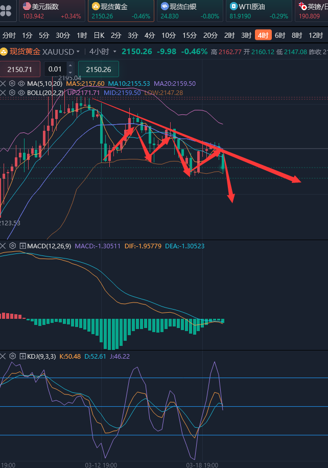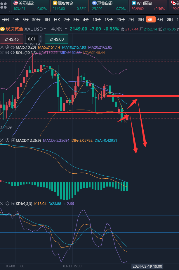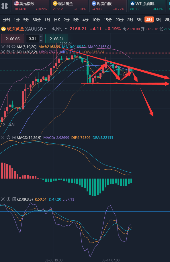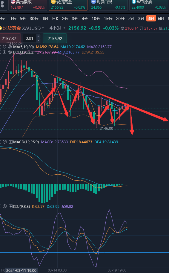 真正的敌人并不是所谓的庄家或者机构,而是你自己,是你自己的贪婪与恐惧。投资是长久之计,不是一朝一夕,所以不可操之过急。短暂亏损不足为惧,每一个成功的投资者都是踩着一次次失败步入巅峰的。历尽天华成此景,人间万事皆艰辛。希望你我顶峰相见! ————————消息面 周三(3月20日),现货黄金窄幅震荡交投于2158附近,近期黄金的上行势头在一定程度上出现了缓和,因过去一两周仓位变动迅速,且现在随着对美联储降息的预期有所减弱,黄金进入窄幅整理走势状况。金价在3月8日创下2,194.99美元的纪录高位,但上周下跌近1%,此前公布的美国2月消费者物价和生产者物价通胀高于预期,降低了美联储提前降息的希望。