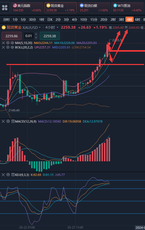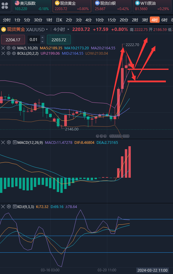 投资交易,其实是在交易自己,交易自己的性格。所谓性格决定命运,一个人在生活中,如果对自己的优点弱点、性格特征不充分了解,要做好交易我觉得是非常难的,为什么?因为投资交易的买卖技术方法、风险管理本质上还是可以学习模仿,但是就算你学会了买卖方法、风险管理,一旦进入交易市场,你会发现投资市场是个有强大诱惑的地方,实际上做出来的动作,跟你学到的会差别非常大,你会迷失在交易的迷宫里苦苦不能自拔。唯有不断学习,不断反省修心,才能练就强大的内功心法,一切始于心而终于心。 ————————消息面 周四(3月21日)现货黄金价格迅速攀升,最高触及2222.65美元/盎司,再次刷新历高点。这一暴涨现象的背后,除
