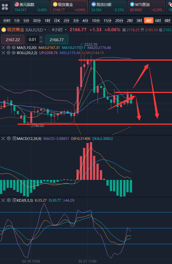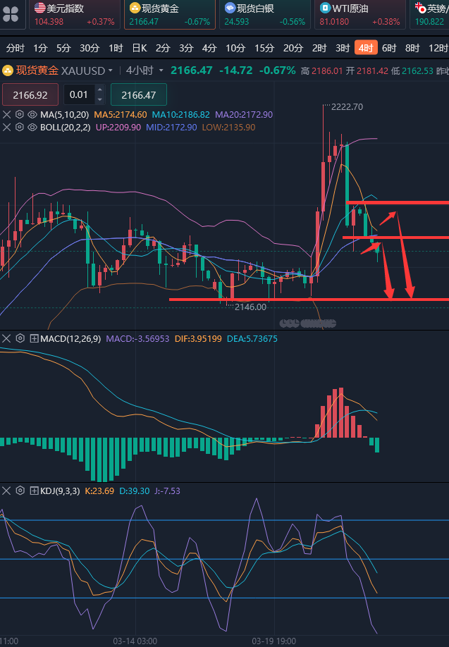 近期碰到很多刚入市操作的朋友,资金也是比较不错,但是一定要谨记于心,任何行情任何时候都不要仗着自己仓位大而且重仓搏行情,这个市场做交易是循序渐进的,试想一下有几个能一夜暴富的?相反,一夜爆仓亏损几十个几百个W的大有人在,所以我们一定不要有任何侥幸心理,市场的风险是未知的,往往都是枪打出头鸟,我们要学会在稳中赚钱,默默赚钱,不要去做那种无畏的冒险,你是决定不了市场的,保持平常心态,保持乐观心态,不贪不恋,护住利润才是王道! ————————消息面 3月22日——金价周五震荡微跌,目前交投于2166美元/盎司附近。本周迄今金价上涨0.83%,有望迎来五周以来第四次上涨,因日前美联储维持今年降息的