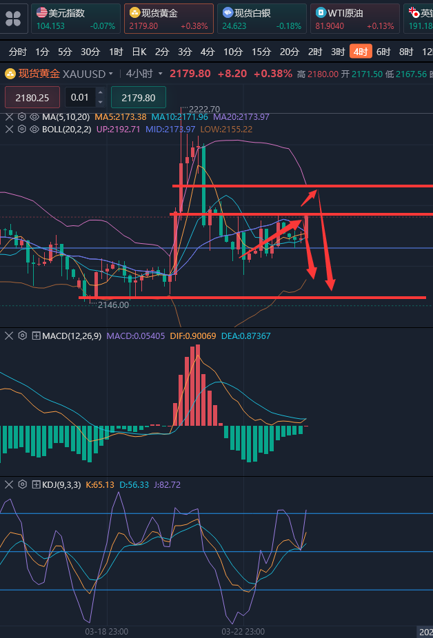 活鱼会逆流而上,死鱼才会随波逐流。生命的价值不在于获取多少,而在于付出多少。人生可以输在起跑线,但绝不能输在转折点。每天都是一个新的契机,若常输,一定是思路和策略有问题,所以即刻改变思路,即刻化危机为机遇,转变思路的速度将决定盈利的速度。 ————————消息面 周二(3月26日)窄幅震荡,现货黄金目前交投于2178美元附近,周一由于美联储从6月份开始降息的猜测,美元面临下行压力,金价走强。此外,乌克兰地缘政治紧张局势升级可能会提振避险资金流向,从而利好金价。投资者的焦点转向本周四将公布每周初请失业金人数,周五将公布美国核心个人消费支出(PCE)物价指数数据,该数据可能会为美联储今年首次降息