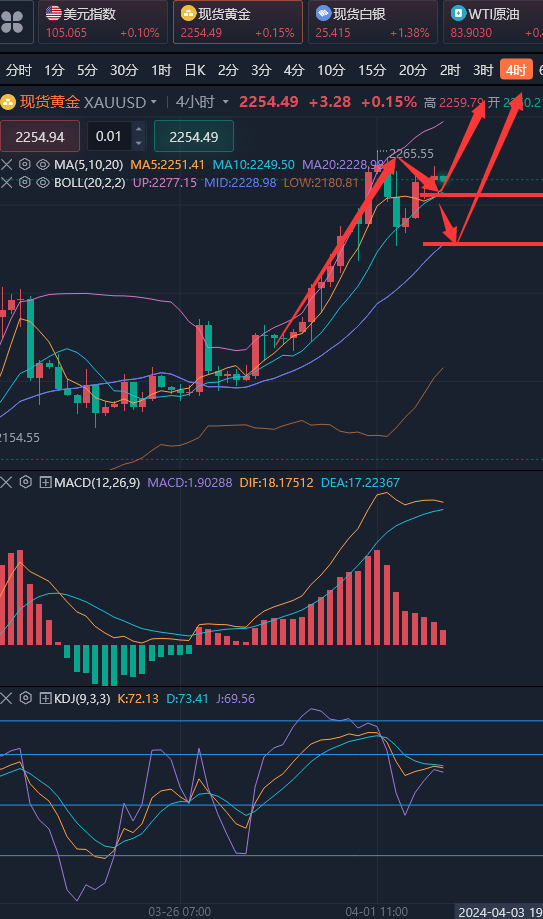 现价喊单能给到散户真正的帮助,以精准的点位,明确的方向,不存模棱两可的策略供大家参考,想盈利其实不难,用最具稳健的操作手法,加上行业领先的风控方案,不赚钱都难! ————————消息面 周二(4月2日)现货黄金窄幅震荡,目前交投于2255美元/盎司附近。金价周一冲高回落,早些时候因为上周五PCE数据后市场对美联储6月份降息预期升温,金价一度刷新历史高点至2265美元,但随后金价回吐部分涨幅,一方面是多头获利了结,另一方面则是美国ISM只在PMI数据时隔一年半后重回50关口上方,市场对6月份降息预期再度回落,美元和债券收益率上涨,令金价尾盘涨幅收窄至0.8%,收报2251.16美元/盎司。短线