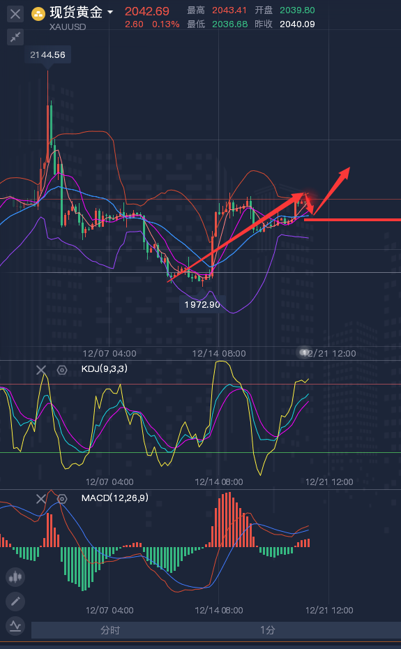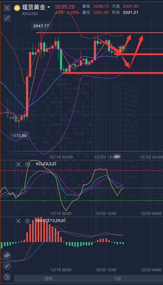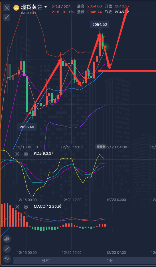 投资理财不是一朝一夕的事,前期的亏损,不代表后期的亏损;前期的获利,不代表后期的获利。我的指导思路,授人以鱼不如授人以渔,帮助找到我的朋友建立起一套自身的操作思路,真心将技术授予你,让你明白在这个市场你正在做的是什么,有何依据。一次选择,就是一次转折!一次尝试,就是一次机会!在我的投资生涯中,我一直都坚持这样的投资理念:投资最重要的不是你一次能够赚取多少,而是你能不能控制风险,落袋为安,长久地立足生存。 ————————消息面 周五(12月22日)黄金价格交投于2048美元/盎司附近,周四经济数据面,美国上周初请失业金人数增长低于预期,美国第三季GDP数据大幅下修。黄金跳涨,美元指数走低,回