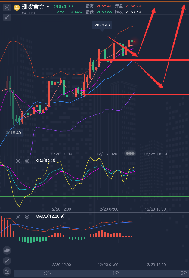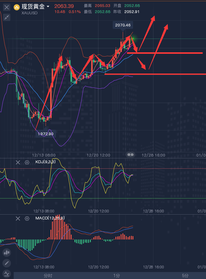 金融市场对每一个人都是公平的,既然有人赚钱,肯定也有人亏钱,投资最重要的不是你一次一周能够赚多少钱,关健在于你能不能长期稳健获利,短线做波动,中线做波段,长线做趋势,方法策略没有好坏之分,只要适合自己能达到稳定赢利都是好方法,但是想在投资中获利,真的没有捷径,只有像苦行僧一样,每日认真作功课,勤于积累。只有每日稳稳地拿住短线收益,我们才能在投资这条道路上走的更远。切勿急功近利,逆势而为,与行情争多空。 ————————消息面 周三(12月27日)现货黄金价格交投于2065美元/盎司附近,周二黄金恢复交易,当前,国际黄金价格在2060美元上方交投,并维持上涨趋势。这一走势的主要推动因素仍然是美
