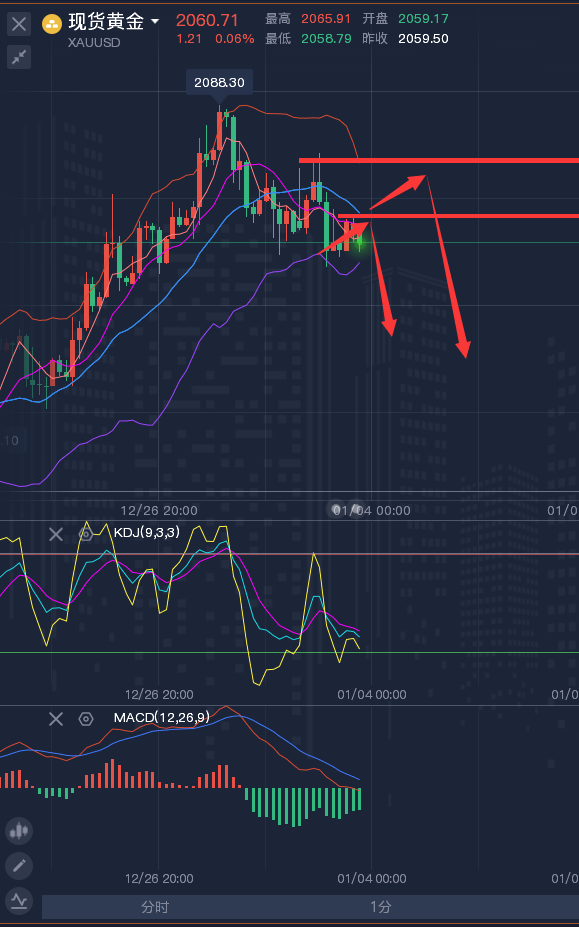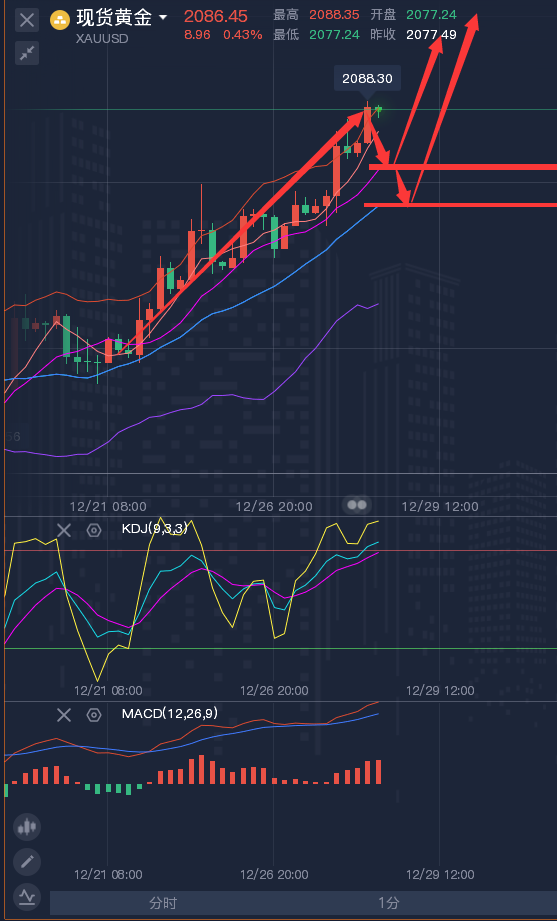 市场上没有任何人能****有百分百的胜率,在我这里,我只强调控制风险,投资一定是从控制风险开始,只有控制住了风险,盈利才有可能,只有控制住了风险,获利也是自然而然。面对剧烈波动的市场行情,我们需要的是等待机会,一击而中,而不是在频繁的交易中迷失自己!合理的把控仓位,利用支撑和阻力位下单,让每一单有理可依,有迹可循。买卖点位不应该是随意进场,请对自己的资金负责,永远记住一句话,专业的人做专业的事,一切实战只为盈利,合作只为双赢。经常做错方向和进出场点位把控的不是很好,操作中亏损的朋友,可与龚关铭一起交流。 ————————消息面 周二(12月26日)现货黄金价格交投于2064美元/盎司附近,仍