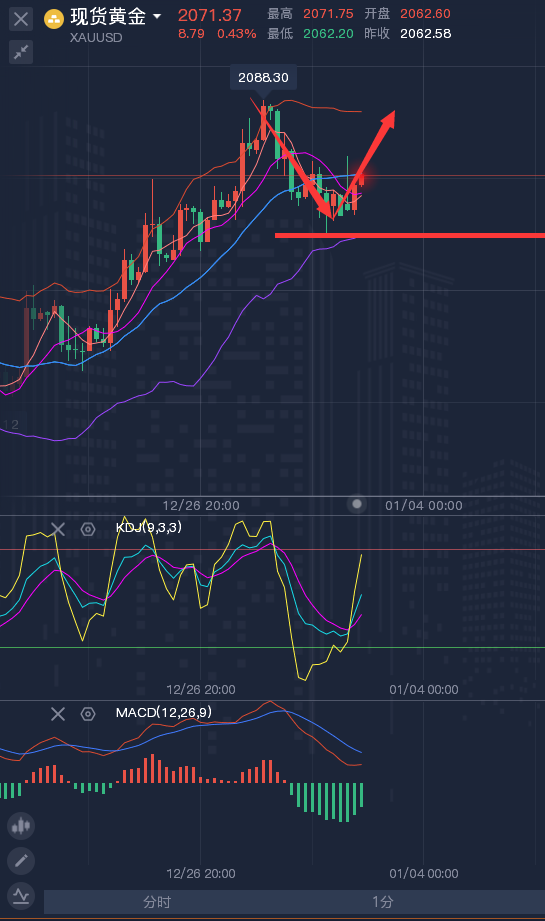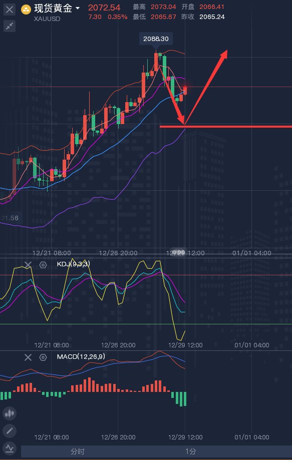 投资不是一朝一夕的事,前期的亏损,不代表后期的亏损;前期的获利,不代表后期的获利。所以,亏损的朋友不要气馁,获利的朋友不要自满,让自己以平和的心态理性的投资。在这个千变万化的市场中,行情的涨跌不是靠个人主观意志所决定的,而是充斥着多于空的搏杀,胜利与失败则时刻伴随左右,但有一点,行情的趋势将会决定未来走向,定势,选位,控仓,成功三部曲,所以,选择远远大于努力,择良师,将会获益匪浅,而我,一直都在。 ————————消息面 周五(12月29日)现货黄金价格交投于2072美元/盎司附近,周四美元指数上涨0.3%,指标10年期公债收益率也有所上升,脱离7月以来的最低水平。美元低位回升,引发黄金一定