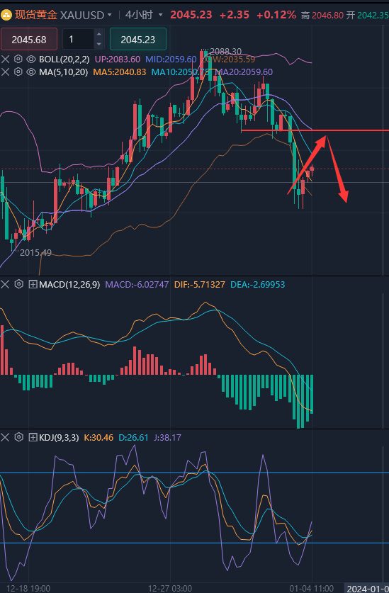 投资理财不是一朝一夕的事,前期的亏损,不代表后期的亏损;前期的获利,不代表后期的获利。我的指导思路,授人以鱼不如授人以渔,帮助找到我的朋友建立起一套自身的操作思路,真心将技术授予你,让你明白在这个市场你正在做的是什么,有何依据。一次选择,就是一次转折!一次尝试,就是一次机会!在我的投资生涯中,我一直都坚持这样的投资理念:投资最重要的不是你一次能够赚取多少,而是你能不能控制风险,落袋为安,长久地立足生存。 ————————消息面 周四(1月4日)黄金价格交投于2043美元/盎司附近,美联储周三发布货币政策会议纪要,纪要内容显示官员们在是否降息的问题上存在分歧。虽然通胀上行风险有所减弱,但官员们