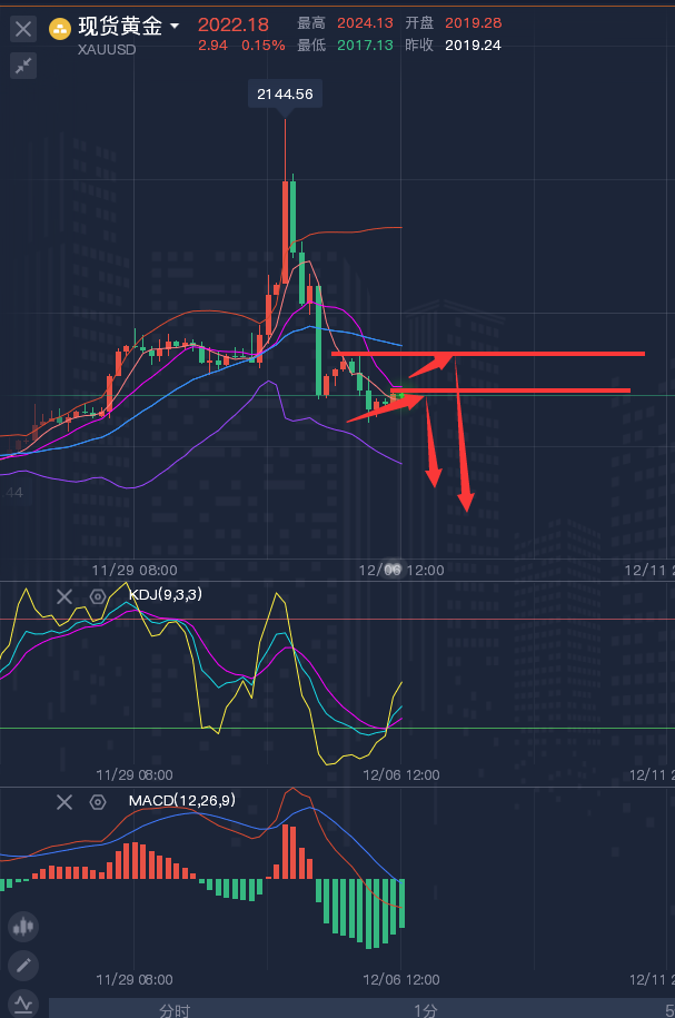 我是龚关铭,希望大家能从我的文章中有所收获和感悟!文章的观点和策略不管和大家意见是否一致大家都可以来找我一起探讨和学习!世上无难事,只怕有心人。贸然入市是愚者,找对人了是智者。一条小船在海里漂流,如果你不扬帆,那么就永远在大海里漂流。文章毕竟具有滞后性,看到的朋友未必做的进去,做进去后也可能不知道后续如何处理!唯有现价,才能真正的保驾护航! ————————消息面 周三(12月6日)黄金价格交投于2022美元/盎司附近,由于劳动力市场进一步放缓,加剧了人们对美联储明年将能够降息以防止经济衰退的猜测,美国国债恢复涨势。10年期美国国债收益率在10月曾短暂超过5%,但在周二下跌至4.2%以下,原