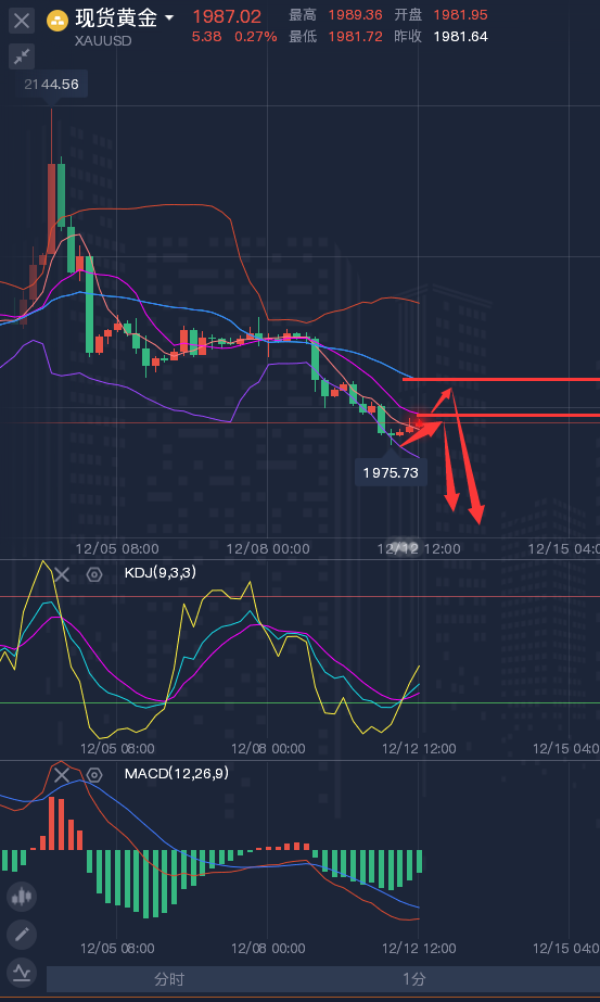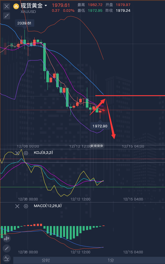 每次写分析,我都希望看到的朋友能有所收获,在这个市场上,平静的表现下其实暗波汹涌,很多投资朋友轻易的进入,往往遍体鳞伤,每天都有很多朋友找到我,寻求帮助,然而更多的只是看完分析后迅速的找到下一篇继续看。我希望我能帮助更多的人,就犹如我自己对这份工作的定位是服务一样,人与人之间是相互的,信任是合作的开始,如果你在投资道路上有所困惑和迷茫可与老师交流。 ————————消息面 周三(12月13日)黄金价格交投于1979美元/盎司附近,北京时间周四(12月14日凌晨)美联储将公布利率决议,美联储主席鲍威尔将在03:30出席新闻发布会。投资者目光集中在对未来经济的预测上,预测与当前市场的预期差异对投
